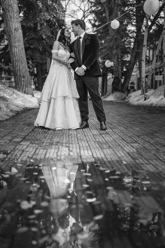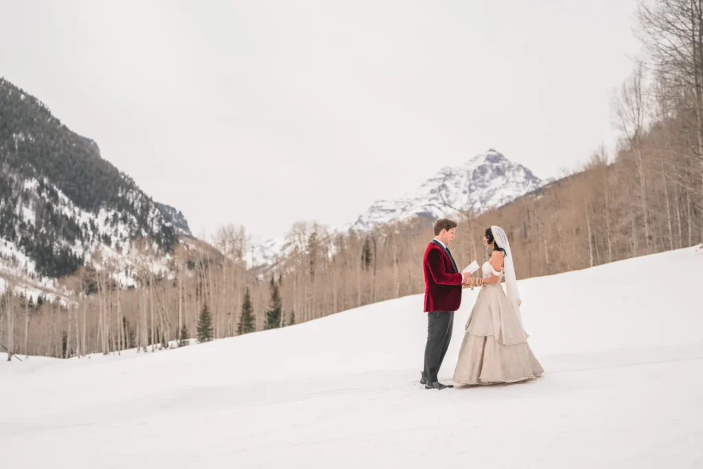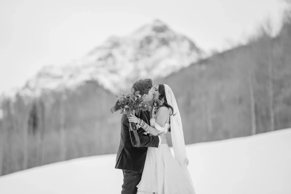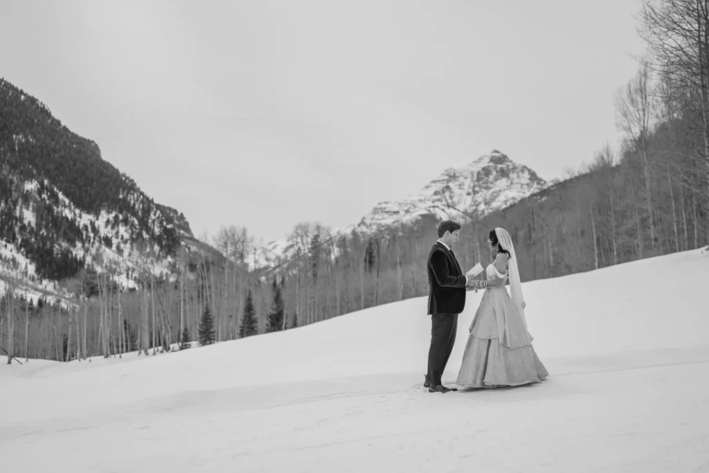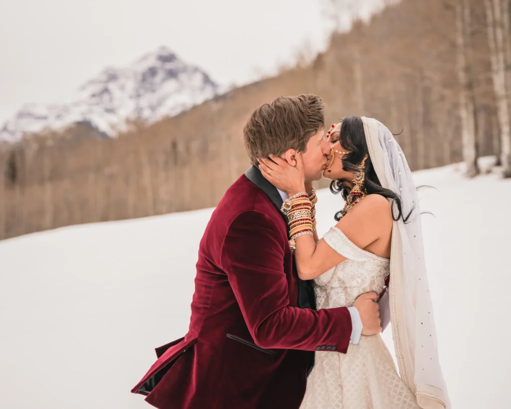 Some wedding days just feel like an adventure from start to finish, and Charlie and Sasha’s elopement at T-Lazy-7 Ranch in Aspen was exactly that. If you’ve never been to T-Lazy-7, it’s one of those places that feels straight out of a postcard—tall pines, snow-covered peaks, and that perfect mix of rustic and elegant. February in Aspen usually means deep winter, but on their wedding day, we had some uncharacteristically warm weather. Of course, warm in Aspen still means plenty of snow, which was perfect for the vision these two had for their day. They originally planned to ride snowmobiles all the way to Maroon Bells, but thanks to avalanche danger, the road was closed. No big deal—Charlie and Sasha rolled with it, and we still got some absolutely stunning shots with Pyramid Peak in the background. I swear, these two could’ve gotten married in a parking lot, and it still would have been beautiful because of the way they look at each other.