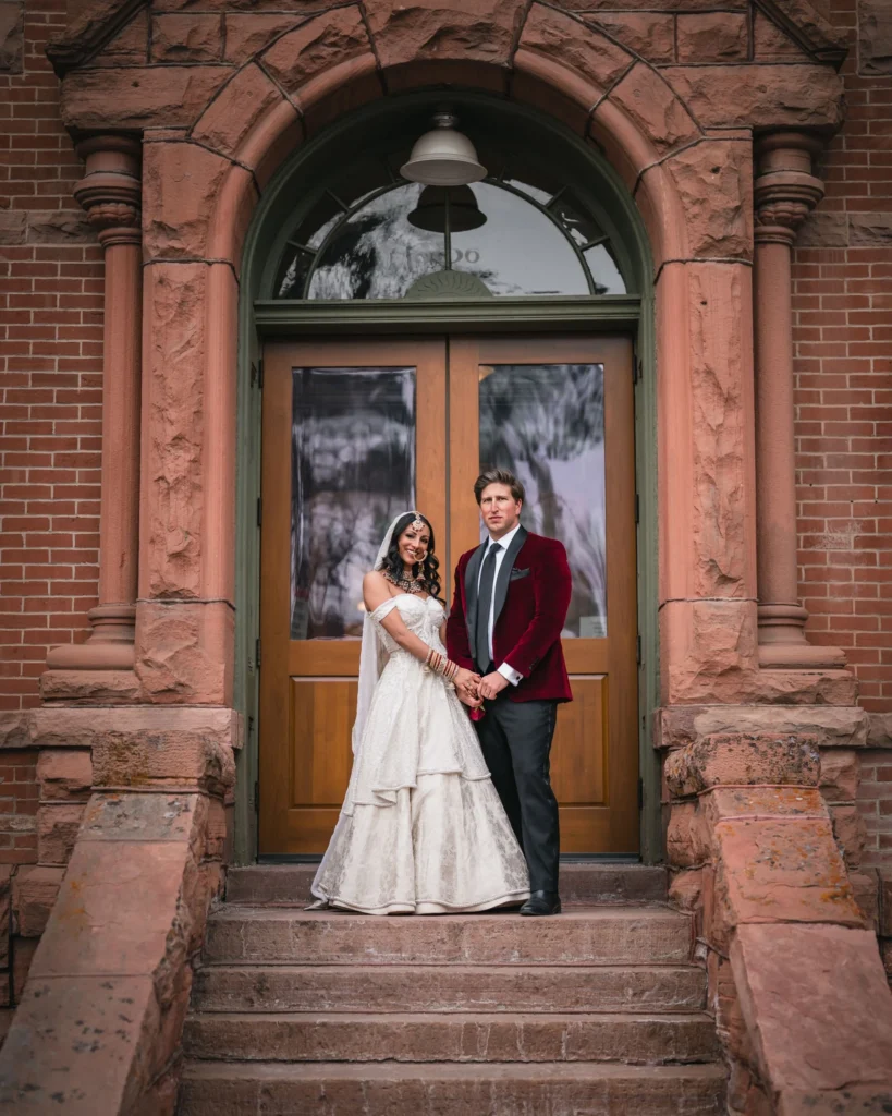 After their intimate ceremony, we made a quick stop at the courthouse to make it all official before heading to a place that meant the world to Charlie—the firehouse. As a firefighter, this spot was more than just a cool backdrop; it was part of his story. There’s something about shooting in a place that holds personal meaning that makes wedding photography even more special. Seeing Sasha standing in front of the fire trucks in her dress, with Charlie beaming next to her, was one of those moments that just felt right. It was the perfect mix of their love story and real life coming together in the most beautiful way. Before wrapping up the night, we made a stop at Hotel Jerome, where they were staying, and grabbed a few photos in the stunning lobby. The rich, historic vibes of the hotel made for such a cozy contrast to the snowy mountain backdrop earlier in the day.